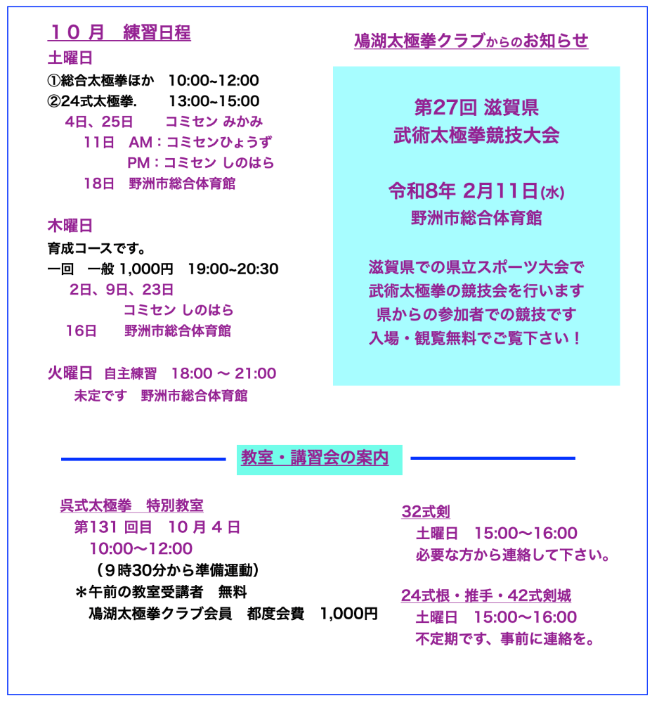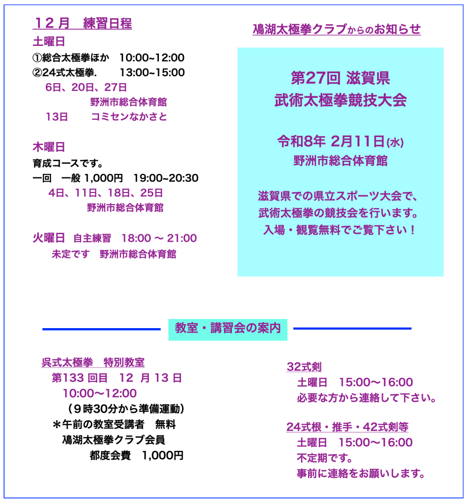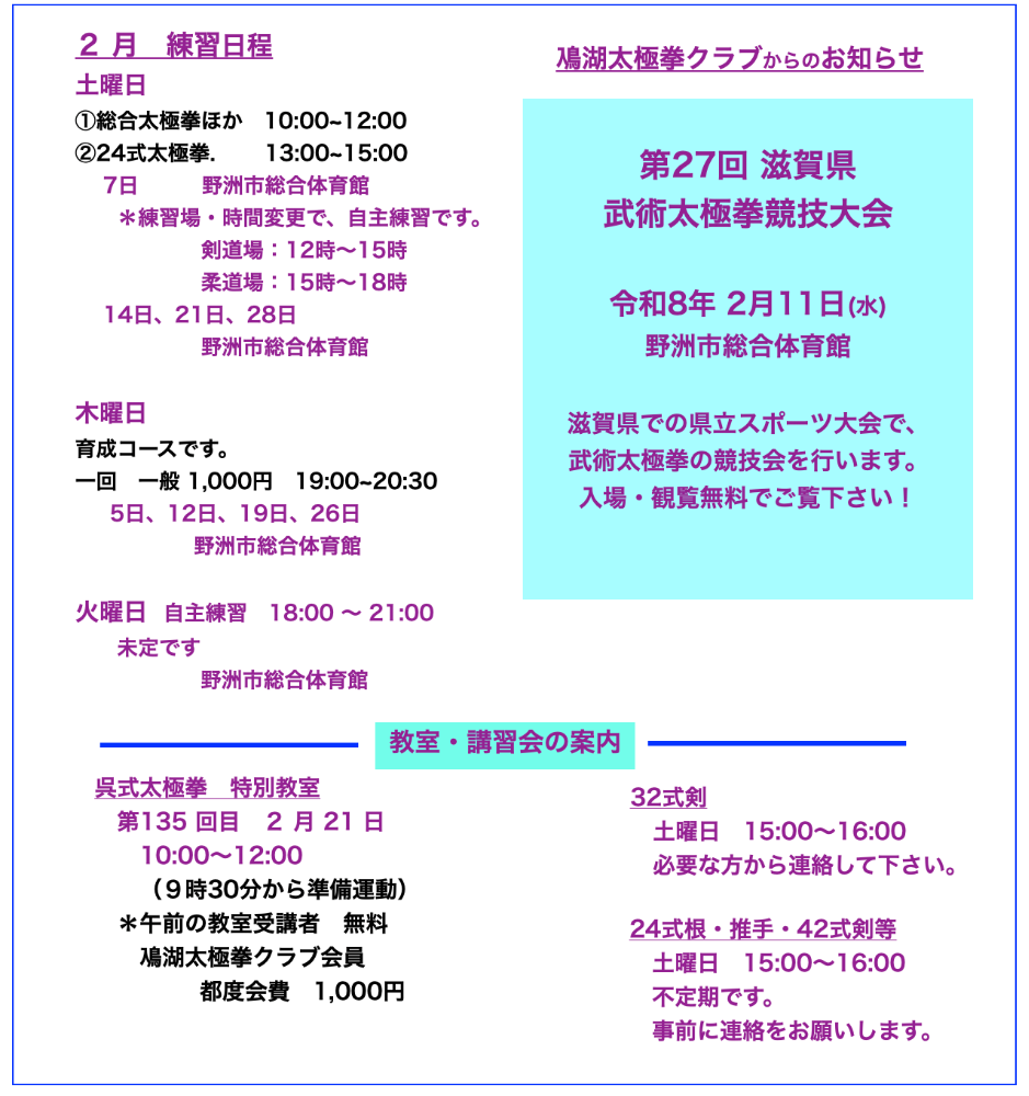 鳰湖太極拳クラブの練習活動に併せての練習日程、教室、講習会、更に太極拳への体験にトライしてもらえる無料会を進めています。